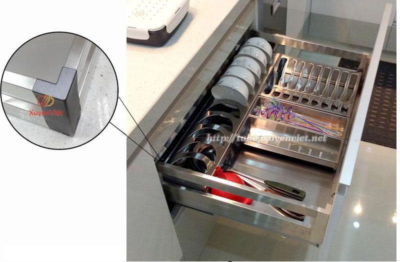 Giá rút bát đĩa inox hộp GNĐNH 304 là phụ kiện bếp loại gắn cánh tủ bếp dưới: kiểu dáng hiện đại sang trọng, với ngăn bát, đĩa riêng biệt, cùng khay đựng đũa, thìa rất ngăn nắp và tiện dụng. Bộ đã bao gồm ray giảm chấn.