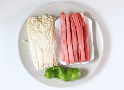 - 200g thịt bò thái lát mỏng và dài, 200g nấm kim châm, 1 quả ớt xanh, ớt đỏ, ít hành, gừng