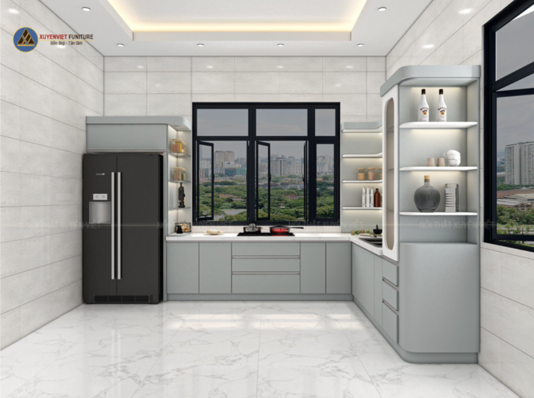 Mẫu tủ bếp chữ L được thiết kế với đa dạng chức năng