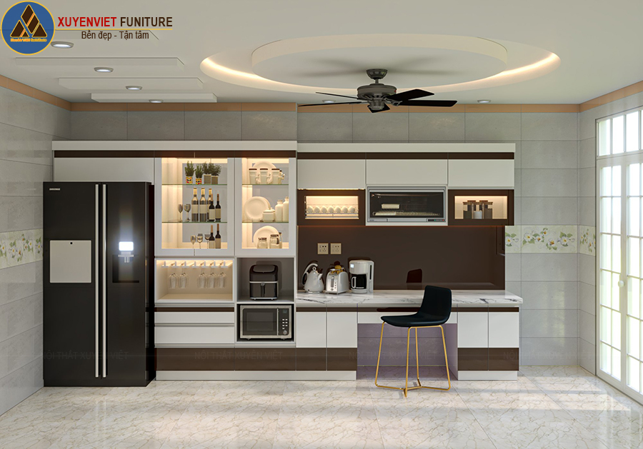 - Tủ bếp chữ I nhà chú Kiệt được trang bị đầy đủ các công năng tiện ích. Tủ có có hệ tủ trên co kịch trần, tủ dưới, tủ lò vi sóng, tủ rượu trang trí và tủ trên tủ lạnh với phong cách thiết kế ấn tượng, không gian lưu trữ đồ khác rộng rãi, thoải mái.