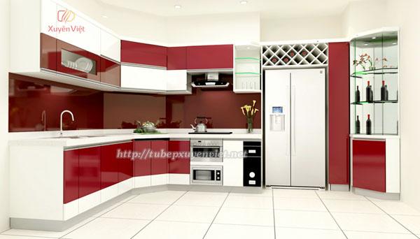 - Tủ bếp sử dụng tấm nhựa PVC FOAM cao cấp dày 18mm có đặc tính nổi bật như: Siêu bền trong nước, không nứt xé, ẩm mốc, mối mọt, không cháy, tuổi thọ rất bền... Kết hợp line 2 màu đỏ đun - trắng với công nghệ phủ sơn men bóng ánh kim độc quyền tại Việt Nam.