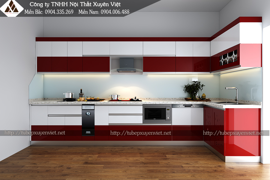 - Tủ bếp chữ L có kích thước 4.19m x 1.47m được làm bằng chất liệu nhựa pvc đặc dày 18mm, cánh tủ sơn men bóng ô tô 2 màu đỏ trắng, mặt bàn đá nhân tạo thạch anh màu trắng, kính ốp bếp màu xanh ngọc cùng bộ phụ kiện bếp cao cấp gồm: 1 giá bát đĩa, 2 giá xoong nồi, 1 dao thớt gia vị đa năng, 1 thùng gạo gương màu trắng.