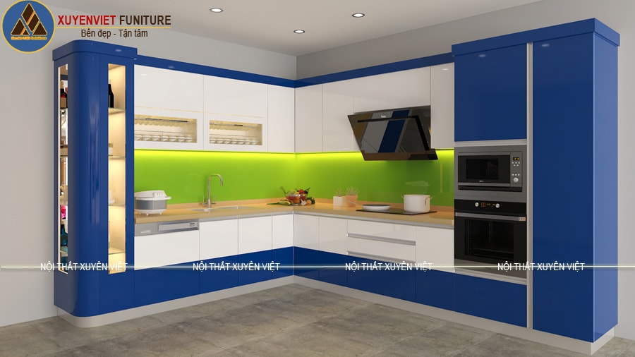 - Bề mặt nhựa đặc dày 18mm sơn phủ men bóng ô tô đôc quyền tại Việt Nam, phối 2 màu Xanh coban - trắng hiện đại. Bề mặt cứng chống xước tốt, bề mặt mịn đồng nhất dễ vệ sinh, không bám bẩn, dầu mỡ nên chỉ cần 1 chiếc khăn mềm để bề mặt sạch bóng, luôn giữ màu theo thời gian. Với dòng tủ bếp nhựa PVC sơn ô tô kỹ thuật cao nên rất ít các đơn vị có thể thi công được. Nếu yêu thích dòng này, quý khách hãy tới showroom Xuyên Việt tham khảo.