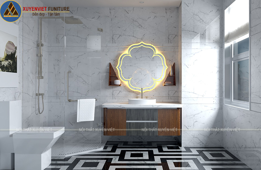 - Hệ gương: nổi bật với gương đèn led hình dáng bông hoa làm điểm nhấn, gương có thể bật/tắt cảm ứng mang đến sự tiện lợi và hài lòng cho người sử dụng.