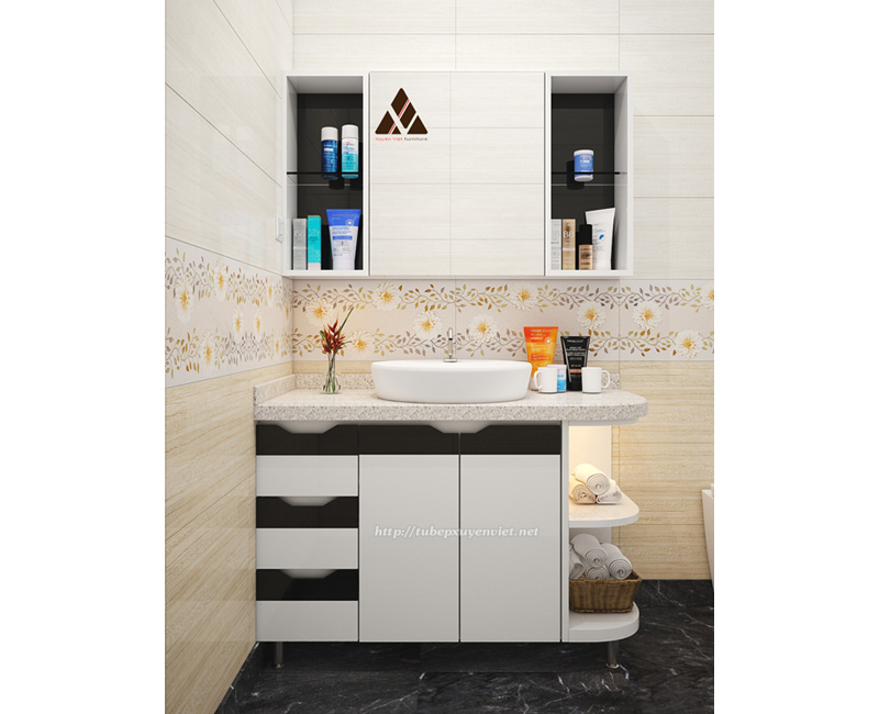 - Phần trên với tủ gương và 2 bên kệ để đồ hiện đại.