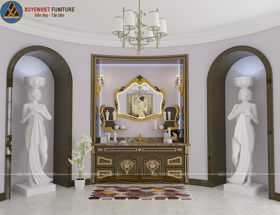 Nội thất mang phong cách tân cổ điển là sự lựa chọn hàng đầu của quý khách hàng cho những căn biệt thự nguy nga, tráng lệ. Mang vẻ đẹp sang trọng, huyền bí, tủ lavabo tân cổ điển dát vàng cao cấp tại Xuyên Việt nâng tầm đẳng cấp của không gian phòng tắm, góp phần tôn lên nét đẹp và giá trị của tổng thể ngôi nhà.