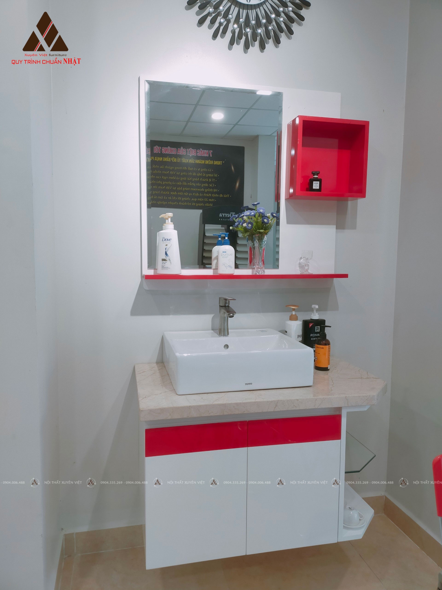 Hệ gương: Phía trên bộ tủ là hệ khung gương có tủ và đợt để đồ được sơn trắng đỏ cùng tông màu với bộ tủ lavabo bên dưới. Chiếc gương có xuất xứ từ hồng kông được mài xăng phanh xung quanh gắn lên hậu nhựa PVC dày 9ly được sơn viền trắng, đợt để đồ và tủ sơn tông đỏ nổi bật.